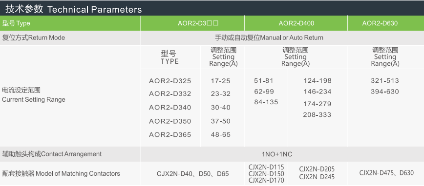LRD-系列热过载继电器适用于交流50Hz或60hz电压660V以下,电流93A及以下的电网中,保护电路和电动机不过载、缺相、启动时间长、阻塞时间长,具有差动、温度补偿、整定电流可调、自动或手动复位等功能,可单独使用,也可与CJX2N-D型交流接触器配套使用。