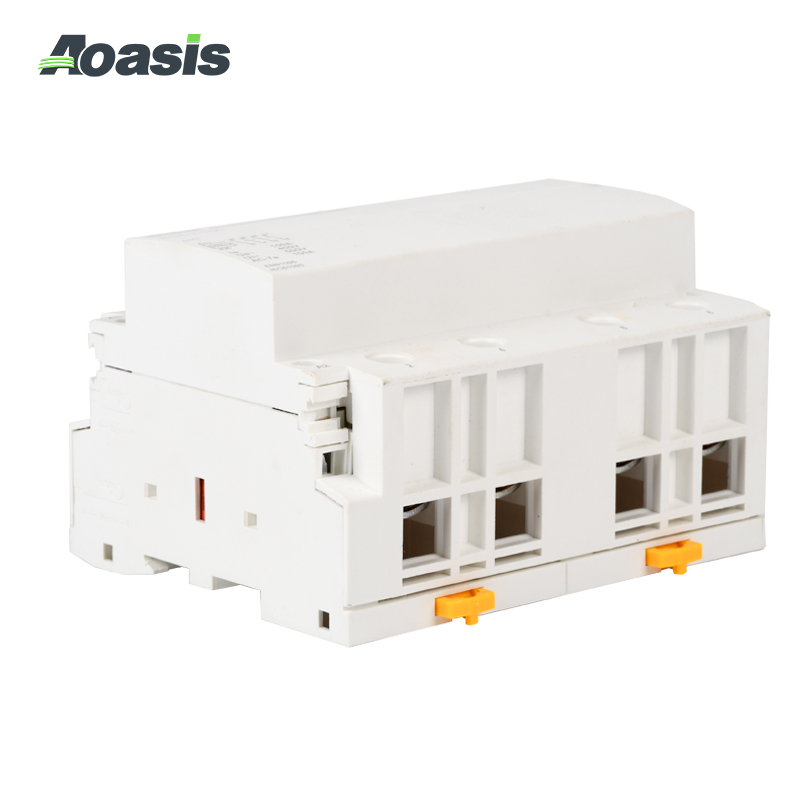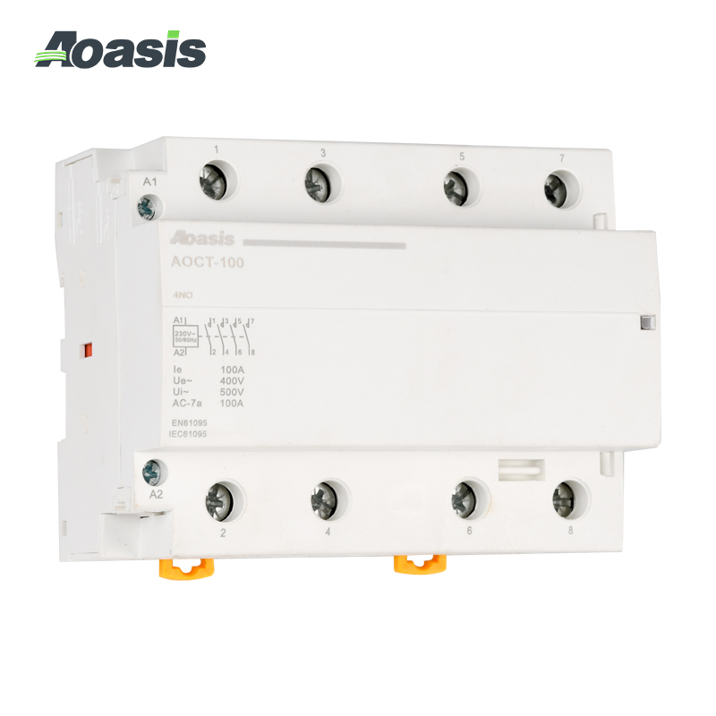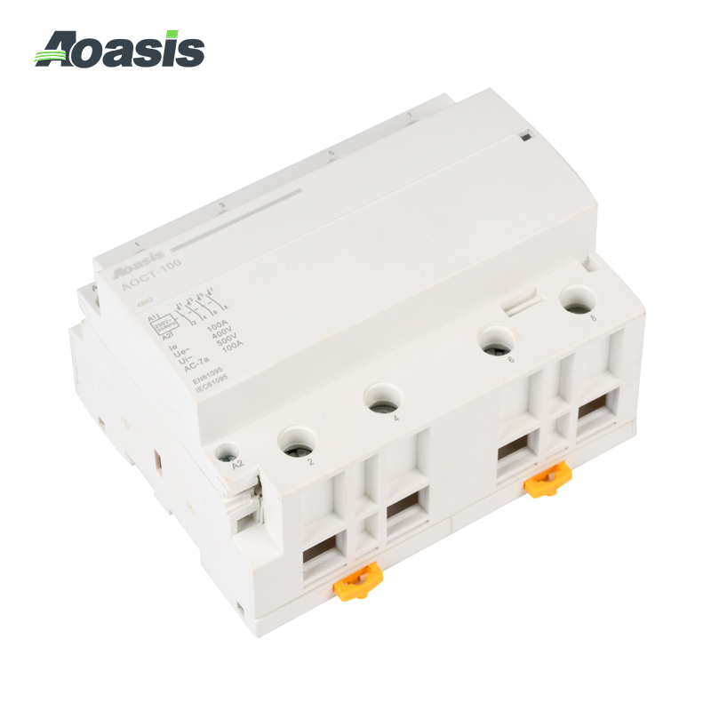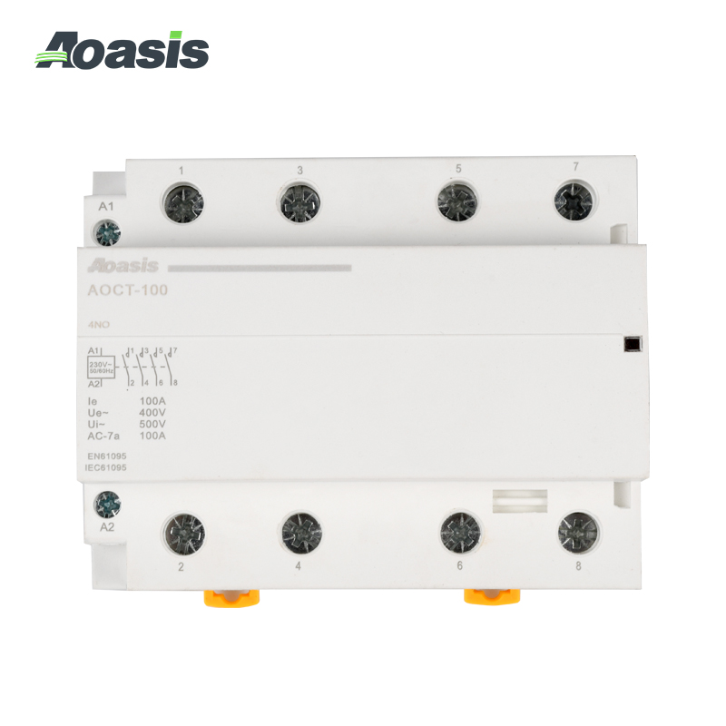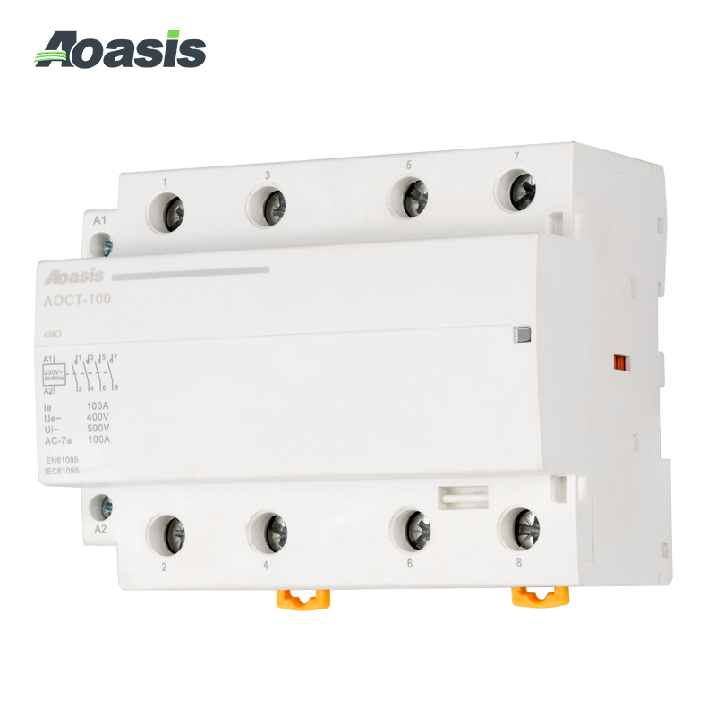 AOCT系列建筑式交流接触器(又称为模数化交流接触器),主要适用于交流50Hz/60Hz,额定工作电压至400V,额定工作电流至100A的电力系统中,在AC-1、AC-7a(无感或低感负载、电阻炉、家用电器和类似用途的低感负载)使用类别下,作远距离开关和控制电路之用,也可用于控制家用电动机负载。家用交流接触器不用于分断短路电流,因此使用时应选配适当的短路保护电器(如小型断路器)。符合标准lEC61095,GB17885。